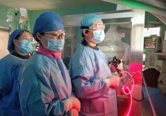 微創(chuàng)外科主任孫萬日在手術中使用3D4K熒光腹腔鏡技術